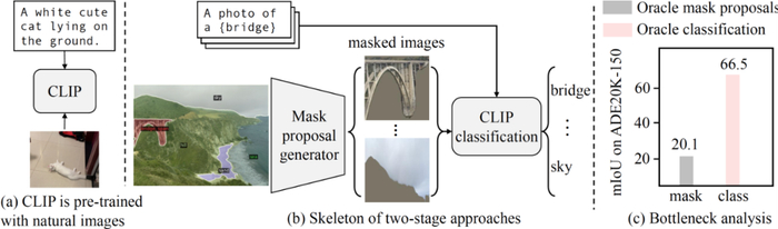 研究者的分析表明,预训练的 CLIP 在掩膜建议上表现不佳,成为两阶段方法的性能瓶颈。
