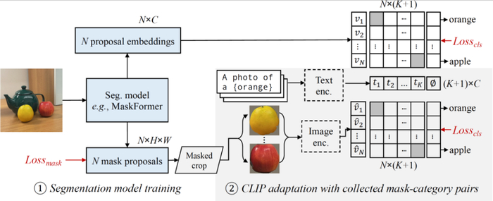 两阶段的开放词汇语义分割方法首先生成类别不可知的掩膜建议,然后利用预训练的 CLIP 进行开放词汇分类。CLIP 模型的输入是裁剪的掩膜图像,与自然图像存在巨大的领域差距。