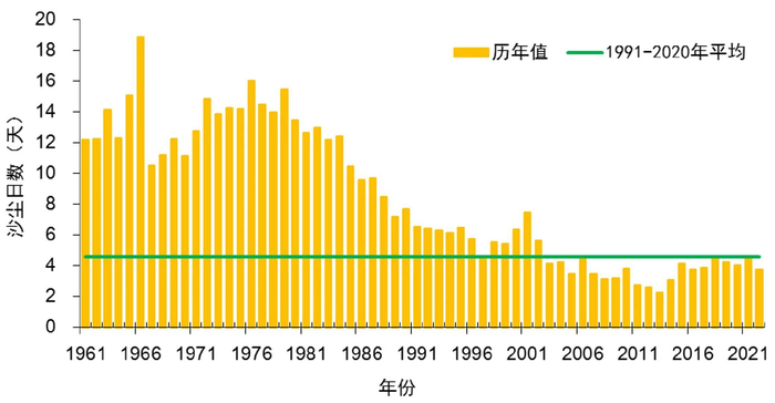 沙尘天气的发生和众多因素有关系,比如气温、降水、天气系统的强度,以及地表的植被、积雪等。近年来我国大范围沙尘天气次数总体呈减少趋势,不能因为个别年份沙尘天气次数比常年同期偏高,就断定沙尘暴增多成为常态,或是进入新的活跃周期。