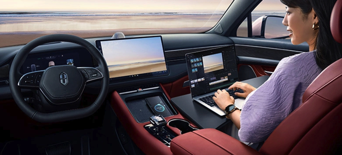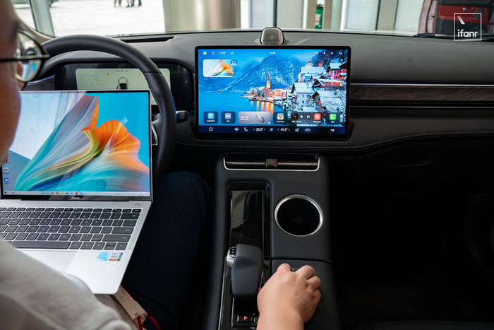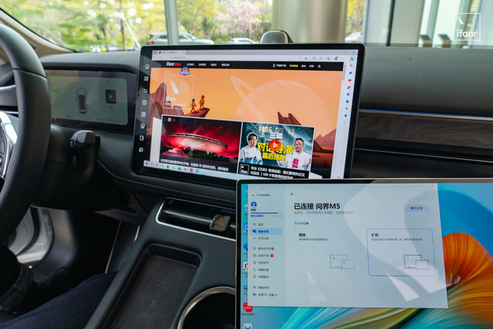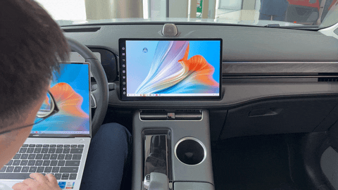 只不过这次协同的是两个「大屏设备」,让座舱里的那块 15.6 英寸中控屏作为华为笔记本电脑屏幕的镜像或者扩展显示,笔记本电脑的键鼠可以在双屏之间跨越使用。