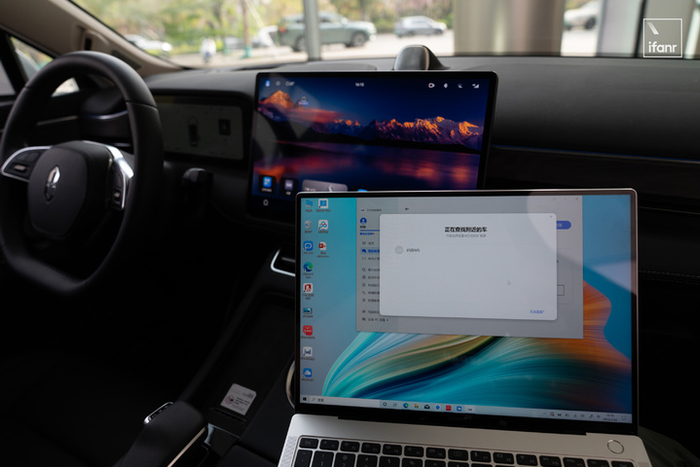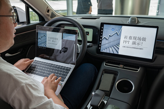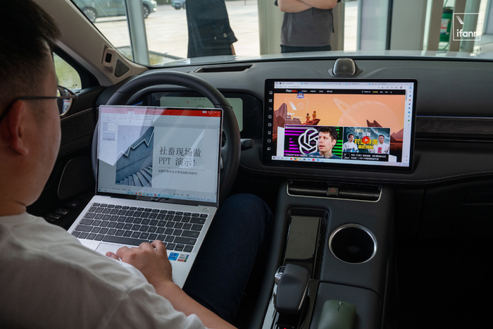 甚至有了副屏,在车里修改和放映 PPT 都可被实现。试想一下,坐在前排副驾的你,可以使用中控屏来直接放映 PPT 给后排的领导/客户去看,你手里的电脑还能看着演示者视图,从容地开始介绍幻灯片的内容。