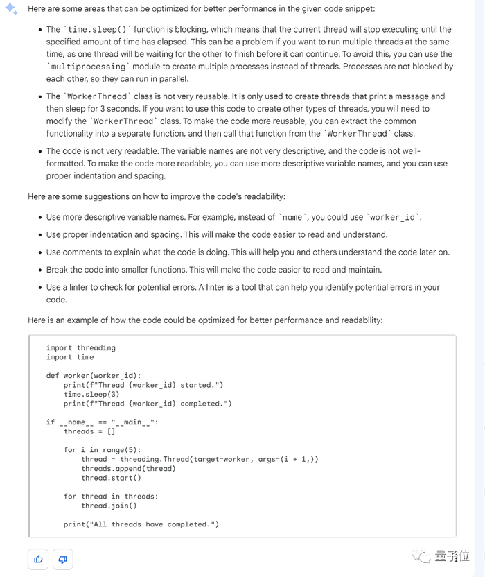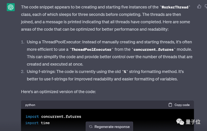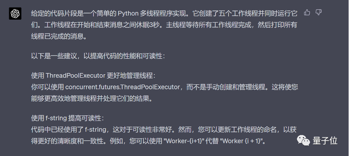 ChatGPT 的回答同样捕捉到了使用 ThreadPoolExecutor 来管理线程的优化建议,但在提高可读性方面犯了一个小错误,被 GPT-4 抓到,因此打了 85 分。