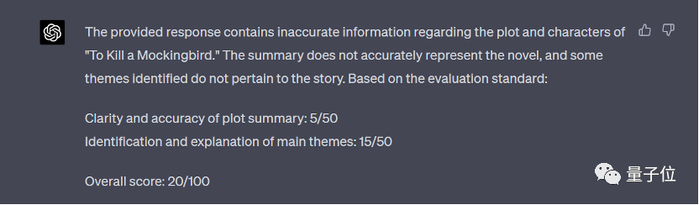 GPT-4 认为相关情节和人物存在错误信息。这个概括并没有准确地反映小说的内容,部分提到的主题与故事无关,因此只给了 20 分。