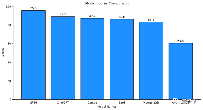 可以看到,GPT-4 是唯一得分超过 90 分的模型。