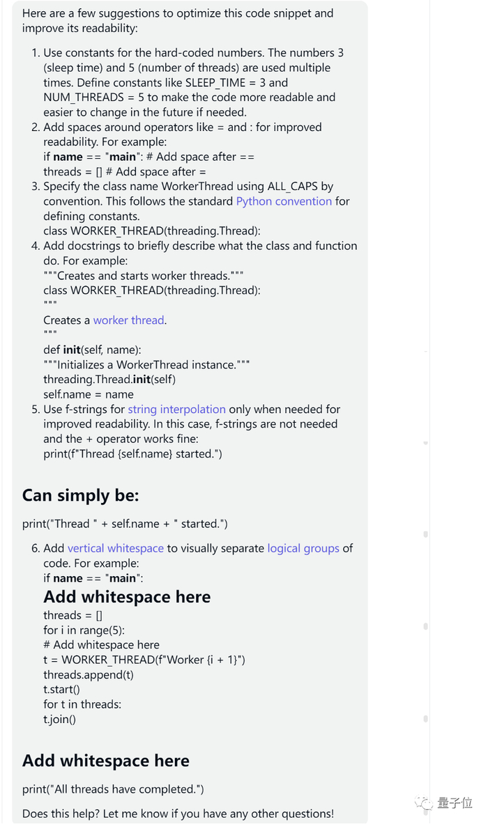 为此还专门提供了具体的增强可读性的建议:使用更具描述性的变量名;使用适当的缩进和间距(尽管原始代码已经格式化得很好);使用注释来解释代码等。