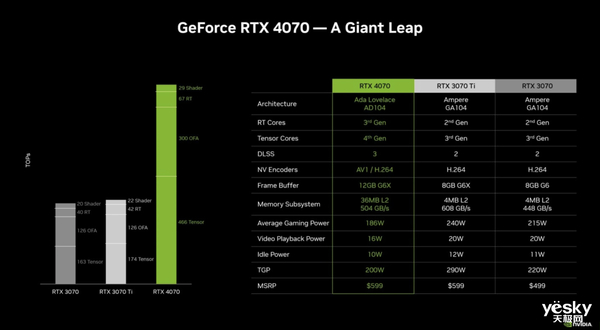 基础规格上,RTX 4070采用AD104-250核心,有5888个CUDA核心,比RTX 4070 Ti少1792个,与RTX 3080保持一致。并且L2高速缓存从个前代的4MB提升至36MB,拥有184个TMUS、60个ROPS以及46个光追单元。