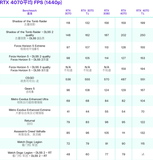 而在开启DLSS 3之后,所有游戏数据都有明显好转,2K分辨率下RTX 4070几乎无敌手。这也印证了此前英伟达的说法,RTX 4070主要面向2K分辨率游戏,而4K分辨率下RTX 4070还是存在不小的性能问题。