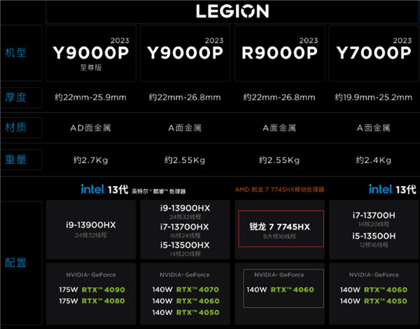差别主要是在硬件配置上,R9000P 2023配备的是AMD的锐龙7 7745HX处理器,这是5nm Zen4架构桌面版的55W TDP魔改版,游戏性能很猛,超过13代酷睿移动版。