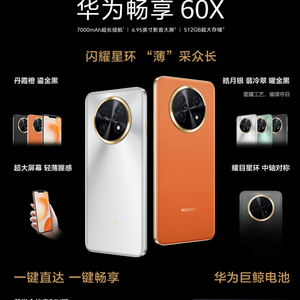华为畅享 60X 搭载6.95英寸影音大屏,支持90HZ刷新。配备7000mAh 超大电池,支持22.5W反向快充。手机配备鸿蒙操作系统 3.0,支持超级NFC等功能。另外华为畅享 60X配有定制X键,可一键打开常用 APP。摄像方面,华为畅享 60 X 前置800万像素镜头,后置5000万像素主摄和200万像素独立景深镜头。