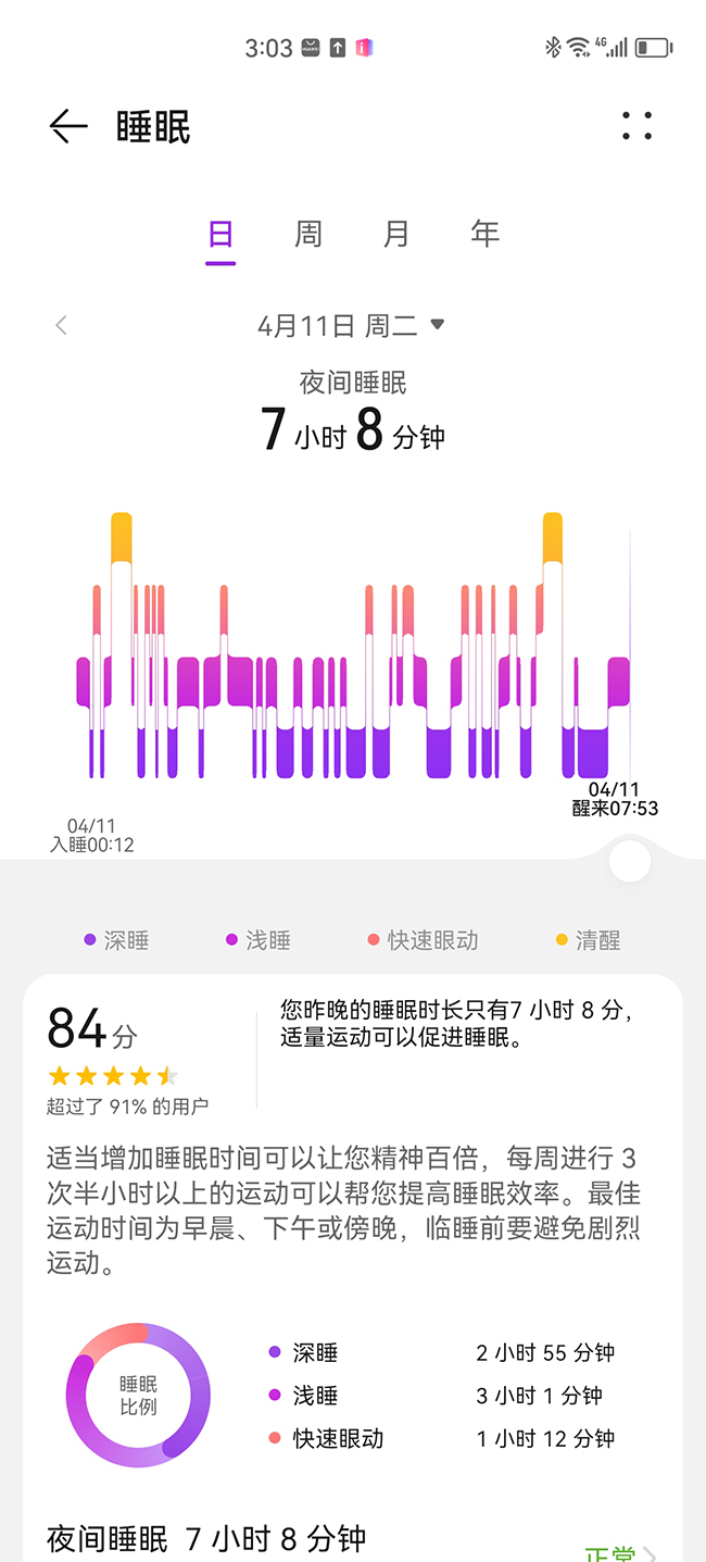 目前各个年龄段、不同职业的人群或多或少都有睡眠问题,提高睡眠质量可以让我们拥有更加充沛的精力来面对生活和工作,所以华为手环 8也将睡眠健康放置到前所未有的高度,它配备了HUAWEI TruSleep™ 3.0睡眠监测技术,通过深度挖掘体动、心率、心率变异性等各项关键性生理指标与睡眠关系,进而建立出准确性更到位的多模态融合算法模型,算法准确性相对于上代的华为手环7约提升了10%左右,可以清晰准确地记录入睡、睡眠、清醒等全过程的睡眠数据,并且可以对这些睡眠指标进行细致分析,从而针对每个用户制定出个性化的睡眠改善建议。