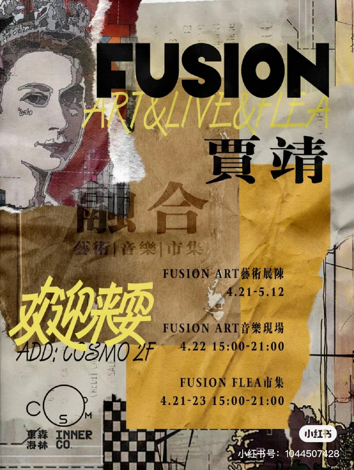 此外,沉浸式看展+音乐live+复古市集又要来了!FUSION ART艺术展陈将于4月21日—5月12日开启,同系列复古市集将于4月21日—4月23日(15:00-21:00)举办,音乐现场将于4月22日(15:00-21:00)举行,更有先锋浪潮艺术家“贾靖个人艺术作品展览。