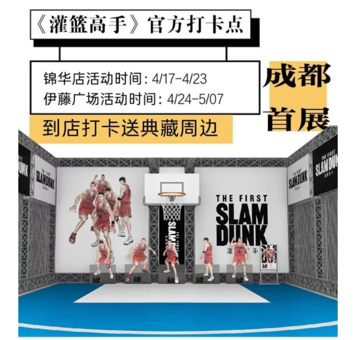 此次官方打卡点有两处——锦华店4.17-4.23;伊藤广场4.24-5.7,五一黄金周期间也能打卡!到店打卡,有机会得典藏周边。4.15-4.30,i伊藤会员100积分即可以29.9元兑换《灌篮高手》特惠观影票价。