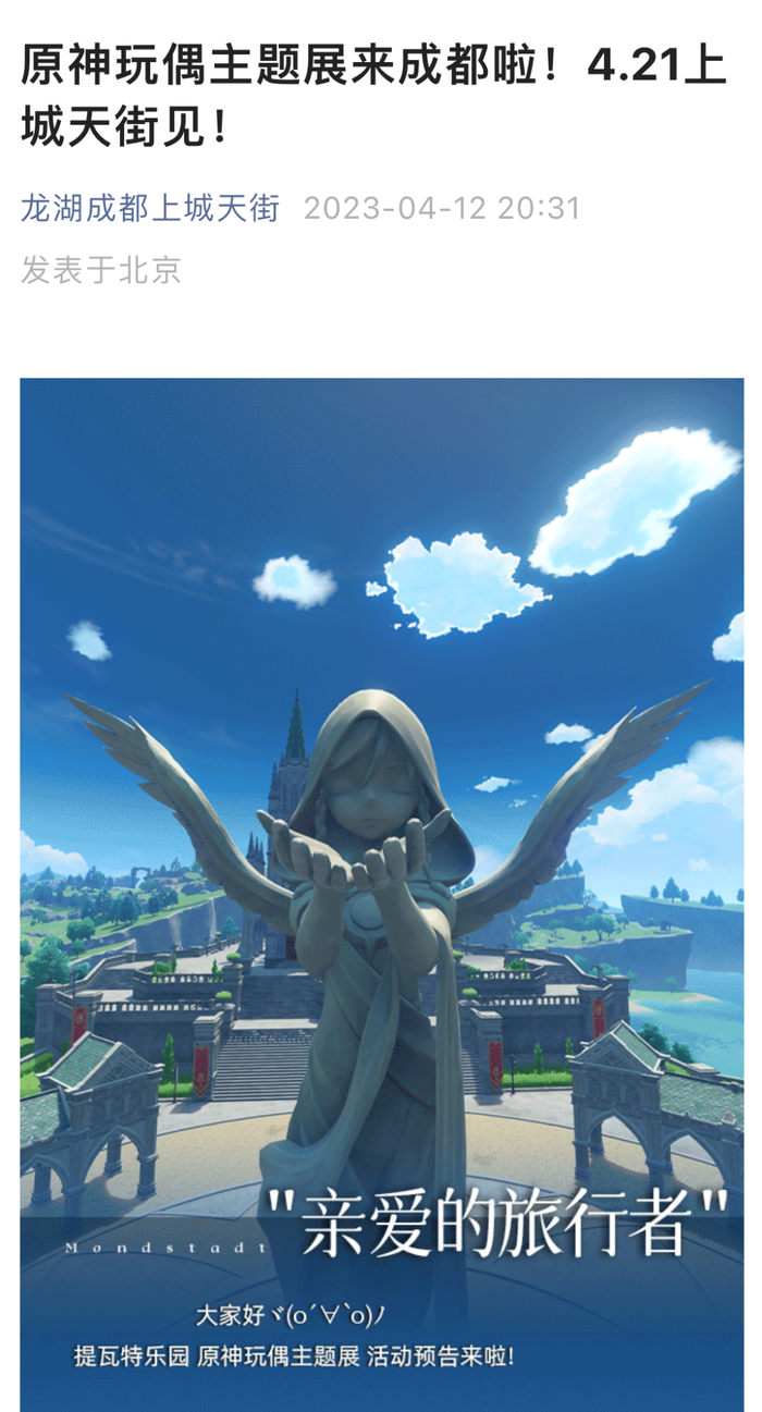 天街 X 原神 联合打造的原神玩偶主题展-成都站,4月21日—5月21日将在龙湖成都上城天街L1中庭上演,届时,将有丰富的游园活动和周边售卖。