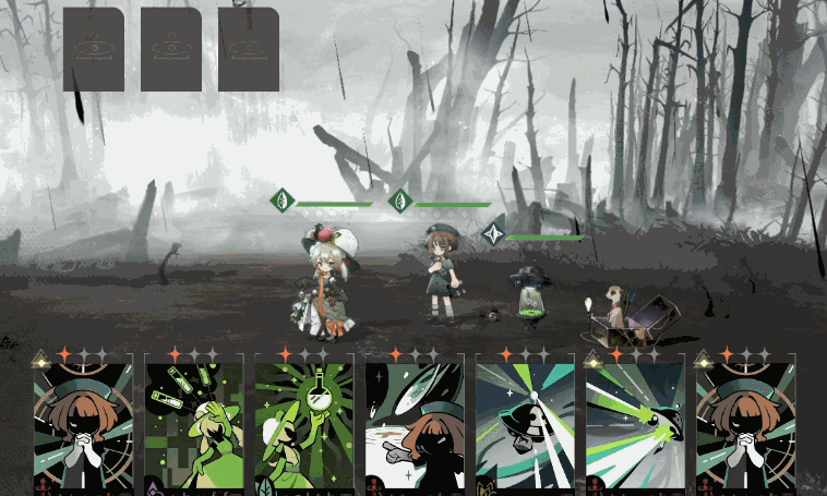 大部分角色的技能卡牌都分为三种:单纯的输出,增益或削弱,最终必杀技。游戏的策略点在于玩家需要在“出牌”与“合牌”之间权衡,以此影响到出牌顺序和出牌时机。