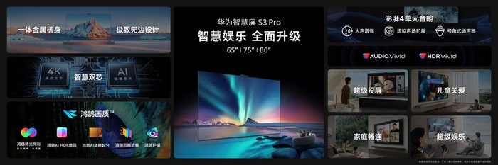 2023年4月17日,华为智慧屏 S3 Pro正式发布。作为今年首款智慧屏新品,华为智慧屏 S3 Pro在产品性能、智慧体验以及外观上实现全方位提升。不仅搭载全新智慧双芯,让性能、画质全面跃升。同时配备了获得10项发明专利的超级投屏功能。基于强大性能及旗舰级的软硬件配置,华为智慧屏 S3 Pro在智慧功能上也带来了升级革新,为用户带来家庭电视场景下的超强智慧体验。