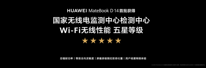 值得一提的是,华为MateBook D 14新品是首批经过国家无线电监测中心检测,并由深圳维天认证中心[3]授予5星无线性能体验的笔记本。经过多项专业测试,华为MateBook D 14新品均以优异成绩过关,为用户的流畅网络体验带来了专业保障。