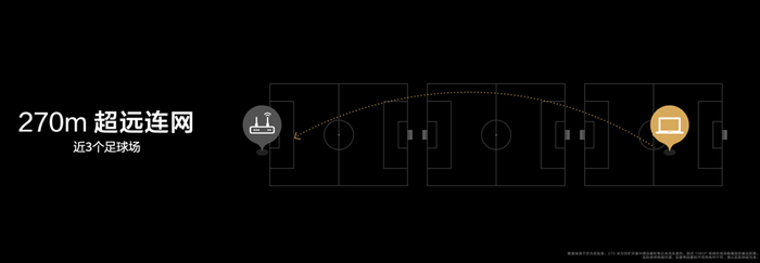 [1]、数据来源于华为实验室,270米为空旷环境中路由器和笔记本间无遮挡,测试1080P视频在线流畅播放的最远距离。实际使用根据环境、设备等因素的不同而有所不同,请以实际体验为准。