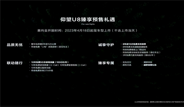 快科技4月18日消息,在今日开幕的上海车展上,比亚迪仰望旗下首款越野车U8正式开售,先期共推出豪华版和越野版两款,售价109.8万元,同时还发布了臻享预售礼遇,详情可参考下图。