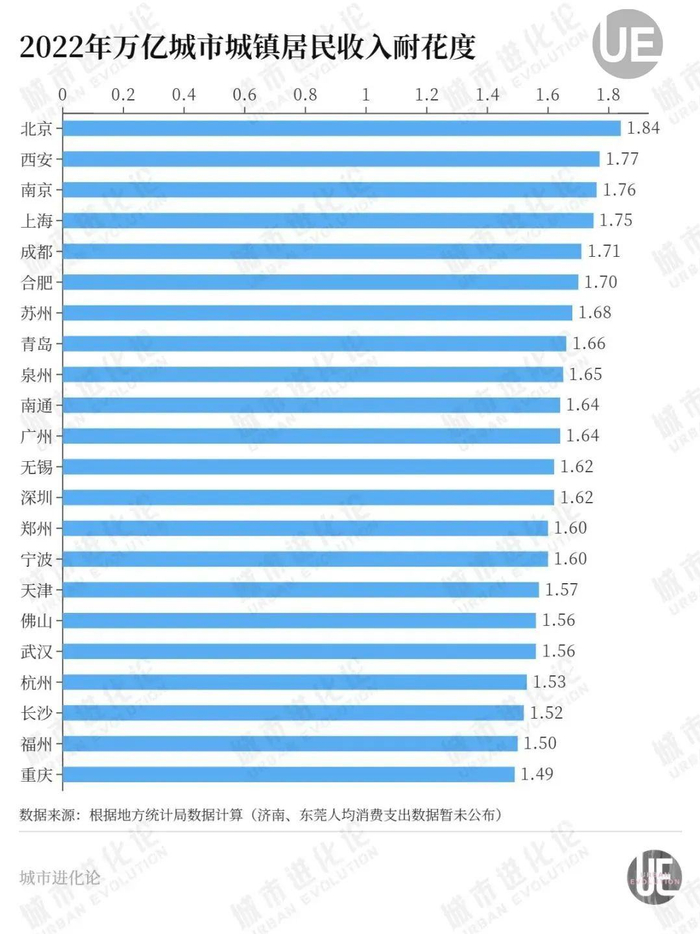 根据测算,万亿城市居民收入耐花度最高的是北京,为1.84。2022年,北京人均可支配收入居24城第二位,而人均消费支出仅排在第六位——数一数二的收入水平与相对低的消费水平,使得其收入耐花度更高。