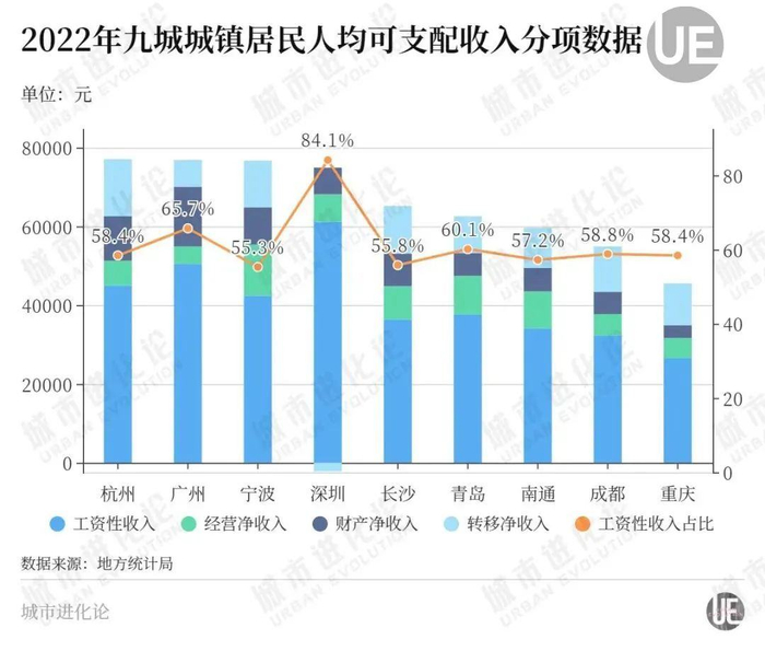 2021年,深圳的工资性收入无论总量还是占比均高居万亿城市之首,分别为59095元、83.4%。不仅妥妥坐实“奋斗之城”的名号,也从侧面印证了深圳可观的就业吸引力。