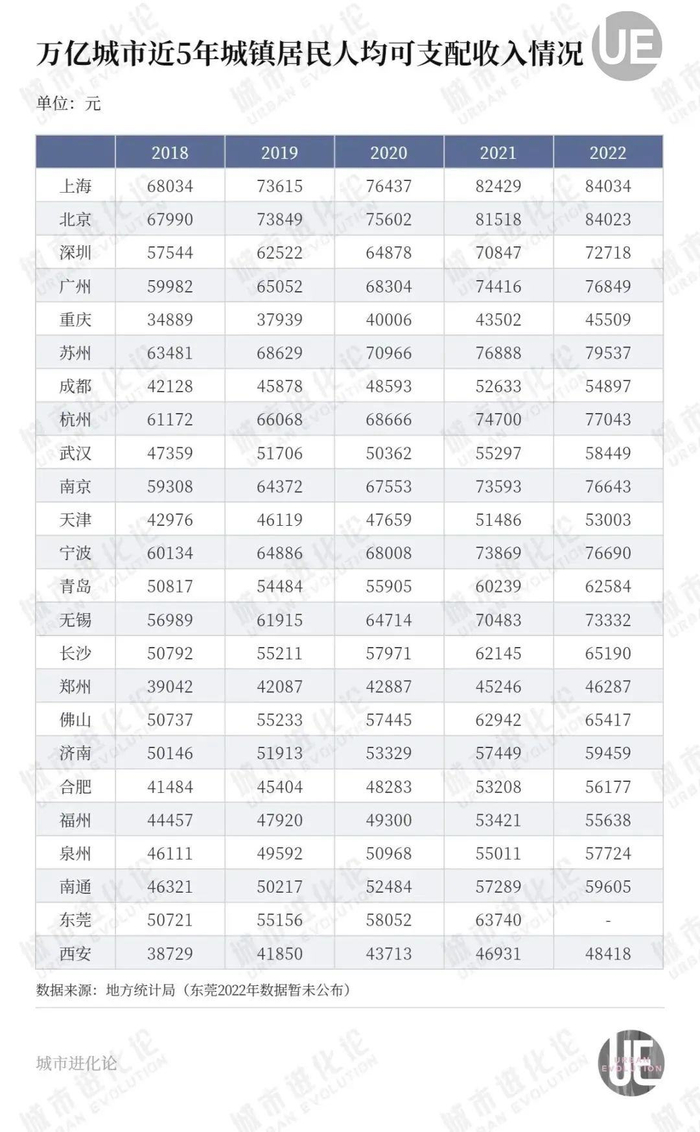 万亿城市2022年度人均收支数据于近期陆续公布。