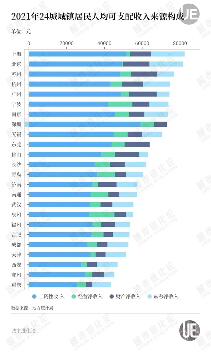 比如可支配收入最低的重庆,其工资性收入也在24城中垫底。郑州、西安情况也类似。