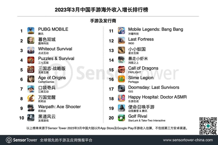 Sensor Tower商店情报平台最新数据显示,2023年3月中国手游产品在海外市场收入及下载量排行榜,详细榜单变化如下。