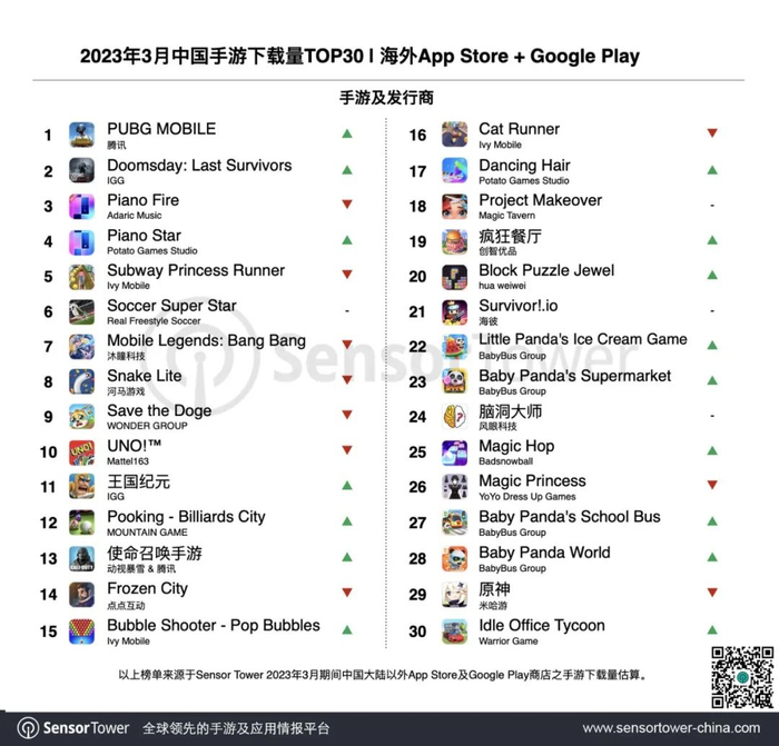 腾讯《PUBG Mobile》3月海外下载量环比增长21%,重回下载榜榜首。