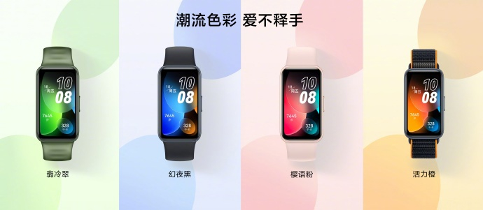 华为手环 8 机身(表体)重 14g,重量减少 12.5%;厚度 8.99mm,厚度减少 10%。华为手环 8 采用轻薄立边全面屏设计,共有幻夜黑、樱语粉、翡冷翠、活力橙 4 种不同配色,搭载 1.47 英寸炫彩大屏,支持 10000 + 精美表盘和智能穿搭表盘。