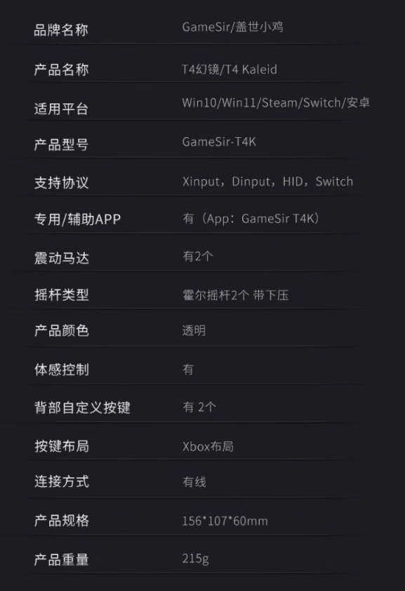 盖世小鸡 T4 幻镜多平台手柄现已开启预售,首发价 239 元,附完整参数表: