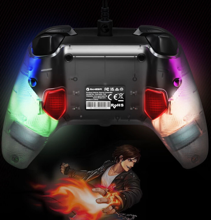 盖世小鸡 T4 幻镜多平台手柄是一款有线手柄,采用 Xbox 手柄布局,配有波点全透外壳,以及左右两侧的 5 区域 RGB 灯条,可随音乐节拍律动变化。