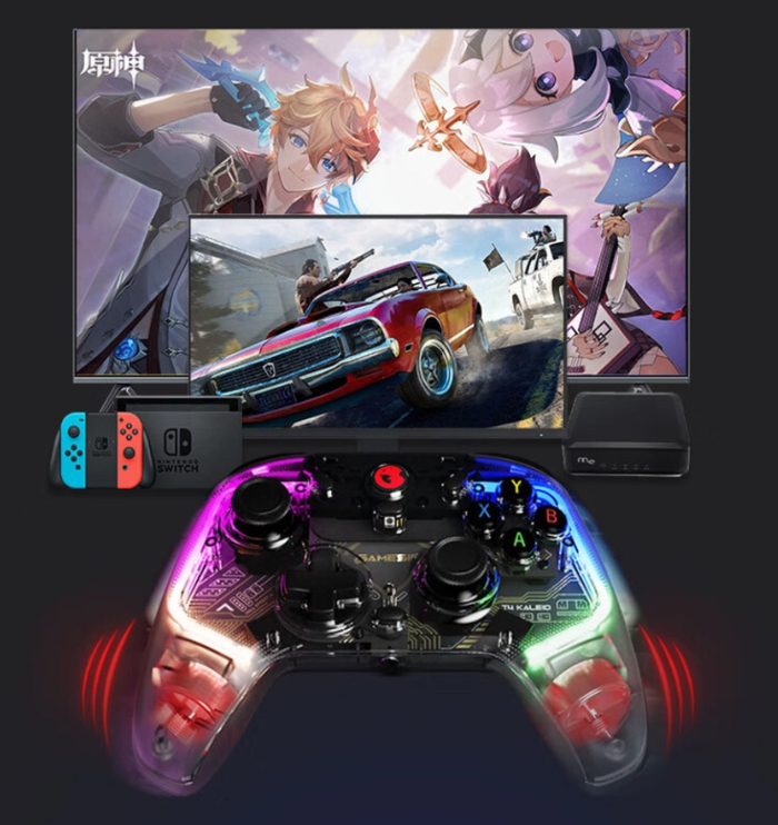游戏手柄对于很多年轻人来说都不陌生,不过对于很多人来说仅仅手机或者电脑操作就足矣。一般使用手柄玩游戏的人要么是比较喜欢游戏,要么是比较追求舒适度。现在的手柄都是可以连接电脑或者电视,直接在大屏幕上玩游戏才爽。盖世小鸡发布了T4幻镜多平台手柄,采用了霍尔3D摇杆和电磁霍尔扳机。手柄布局全透外壳,配有RGB灯条可随音乐节拍律动变化,非常炫酷。大家是不是也都了解过盖世小鸡的手柄,感觉如何?