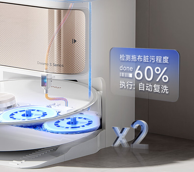 当开启“智能托管”后,扫地机器人每次回洗拖布前,都会进行一次检测,如果浑浊值大于系统预设的清洁度阈值,基站就会将拖布多洗一次,然后再开启下一区域的清洁,以保证拖布的干净。