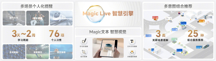 Magic Live 智慧引擎迎来 3 大升级,MagicOS 7.0 可以通过多意图组合推荐、多场景地理围栏泛化以及多维度快速学习,实现多场景、多维度、多意图的场景感知与意图理解。荣耀也为 Magic Live 智慧引擎开放了 Magic Live Kits 开发套件,应用可基于该套件推出个性化服务功能,包括百度地图等已进行了接入。