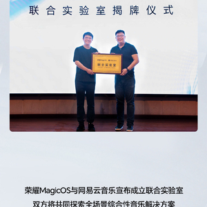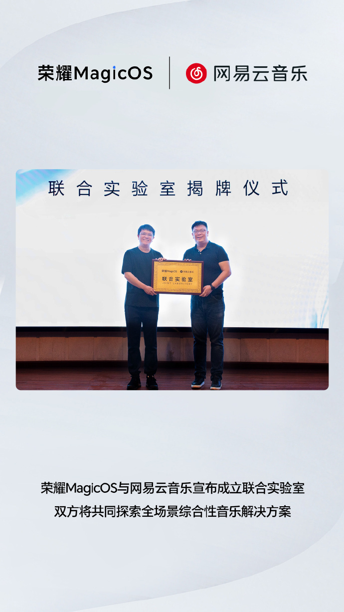 IT之家 4 月 18 日消息,IT之家从荣耀官方获悉,荣耀 MagicOS 与网易云音乐成立联合实验室,双方将共同探索全场景综合性音乐解决方案,在音效与播放体验提升、AI 视频配乐、场景化音乐推荐、音乐跨设备接续等方向展开深入合作。