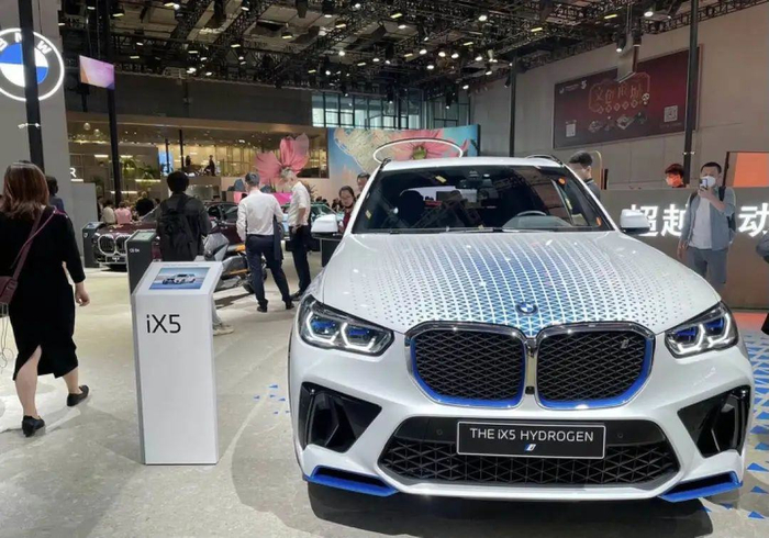 另外在本次车展上,宝马品牌带来了旗下中大型SUV—iX5 Hydrogen。也是国内的首次亮相,新车将基于宝马X5打造,基本沿用X5的设计,细节上增加了符合新能源特性的蓝色元素,蓝色前大灯,车身带有蓝色拉花,轮圈也是蓝色。同时在中网和前包围都采用了全新的网格设计。