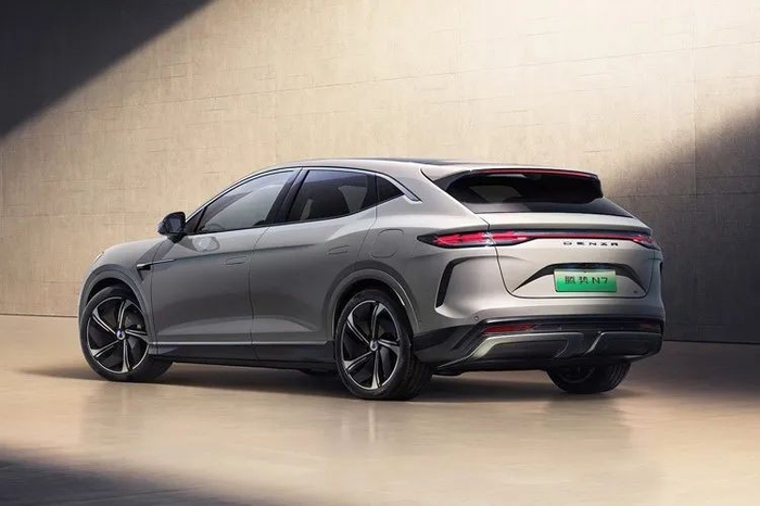 外观方面,腾势N7采用了全新的设计语言,封闭式前格栅搭配犀利的分体式大灯组占据大部分的车头前脸,两侧配备了开口较大的进气口。新车采用了溜背式轿跑SUV的车身结构,B柱以后略向下倾斜的车顶线条。另外,新车外观将会提供双前脸设计。