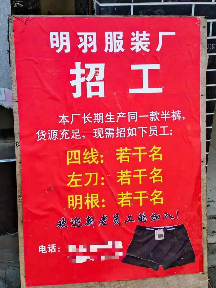 一位女性称,她在福建短裤厂打了十几年工,每月赚三四千元,还要付房租。因为孩子长大了,没法在福建上小学,她决定回老家做短裤。一对农民夫妇在本地种了几十年田,现在第一次进厂,当验货工人。一条条短裤抽出来,剪掉线头,挑出破的,每验一条短裤赚三分半,一天可以验1000多件,每人可以赚三四十块钱。