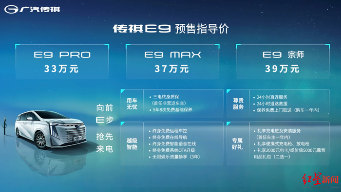 上海车展首日,记者从广汽传祺展台获悉,中国智电MPV新旗舰——传祺E9在上海国际车展全球首秀并开启预售,预售价格33万元-39万元,共计3款车型。