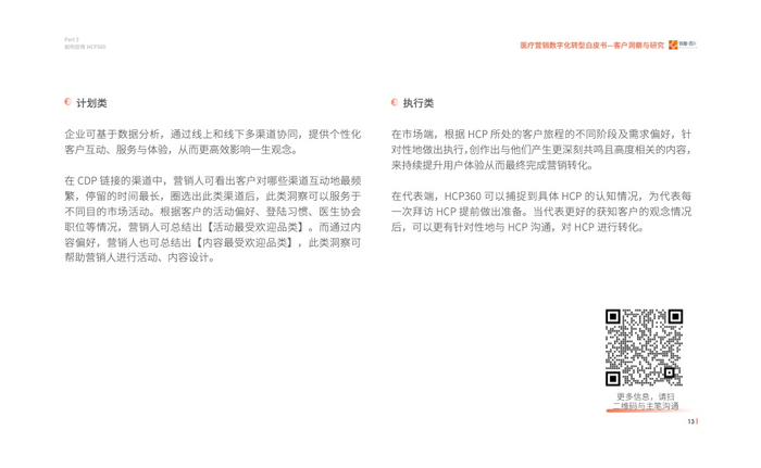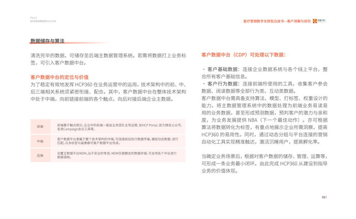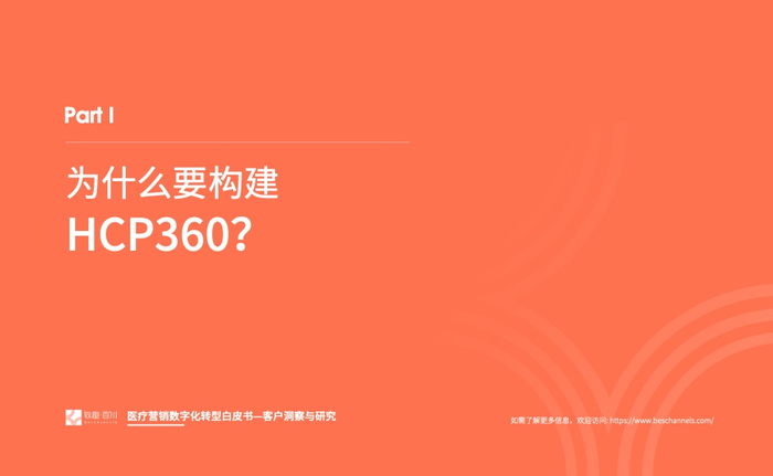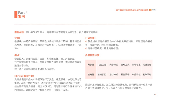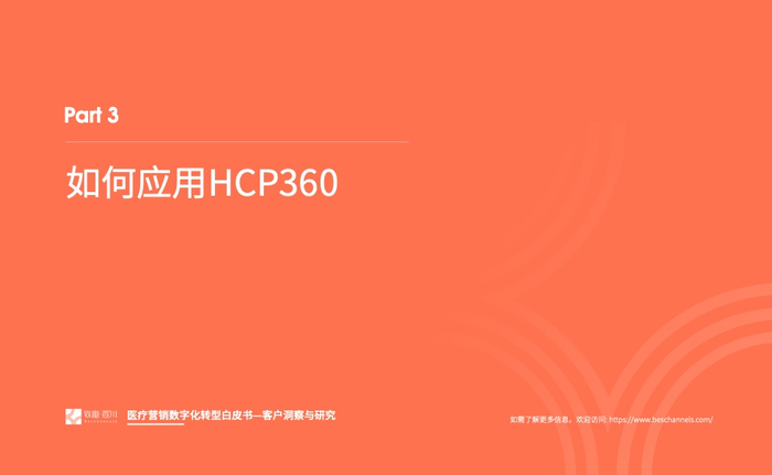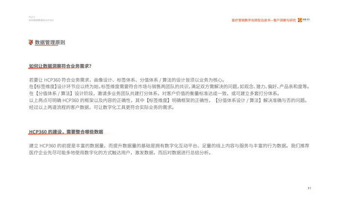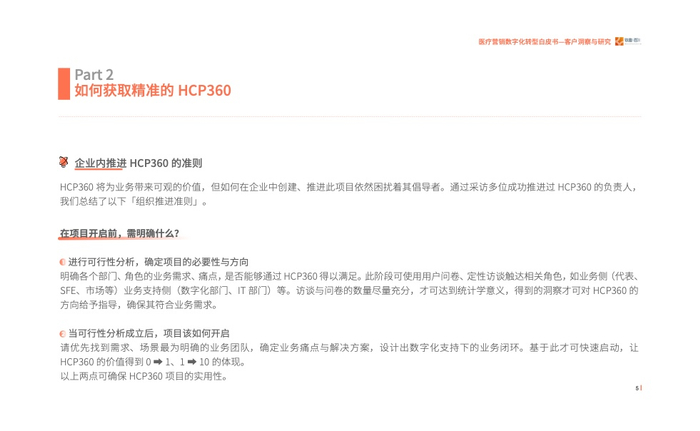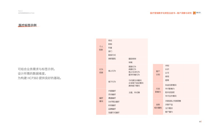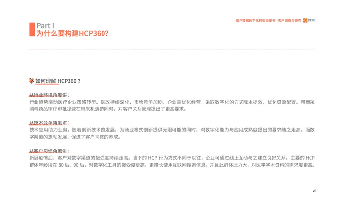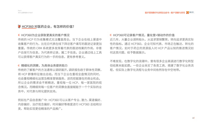 2023年我们发现医疗行业对于数字化营销有了进一步的要求,即精细化的营销,而客户画 像(HCP360)在其中扮演着至关重要的角色。通过采访众多头部企业营销数字化转型的操盘 手、掌舵人,我们走进医疗数字营销的深水区、数字营销核心——客户洞察与研究,其中客 户画像(HCP360)是精细化营销的基石。