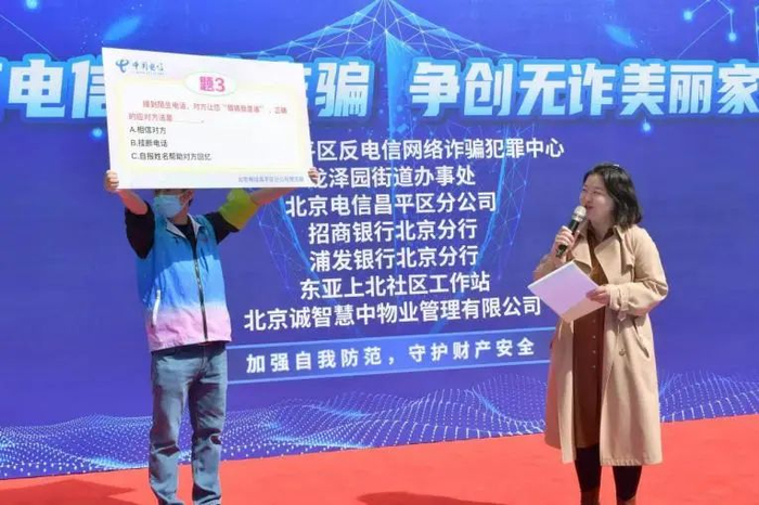 在北京昌平区回龙观街道东亚上北社区,回龙观营业厅爱心大使联合社区经理等电信员工,举办了爱心翼站国家安全知识普及和反诈宣传活动。现场活动中,邀请到周边的居民到场参加竞猜答题,派发国家安全及反诈知识宣传单页,同时现场提供老年人自助血压测量等服务,并向参与活动的居民分发了纪念品。