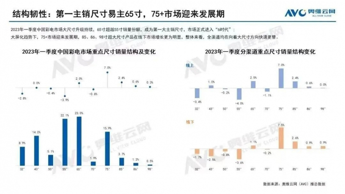 实际上,除在传统声音画质上的创新提升外,企业应该更多的考虑用户的使用场景。由于家庭影院、家庭KTV和游戏电视等概念的普及,电视的功能逐渐发生转移,成为家庭的娱乐中心,并由此衍生出大屏化和颜值化等需求。奥维云网数据显示,2023年一季度,中国彩电市场65寸销量超越55寸,成为第一大主销尺寸。