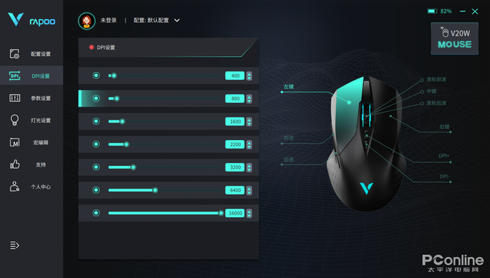 软件内有默认7档可选DPI,可以根据预设使用,也可以自定义调节每个档位参数。以下也是我一般的常用档位,从400-3200,再高就驾驭不了了。