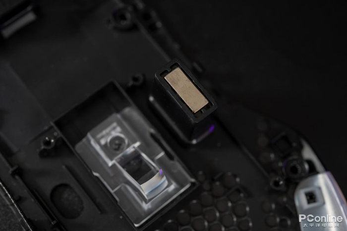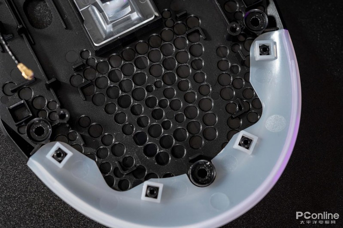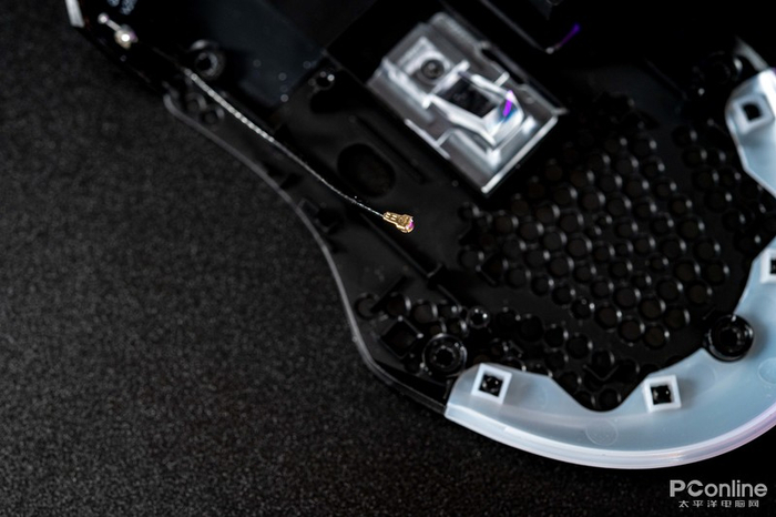 中间是接收器收纳仓的磁铁以及反光板,这里就不用多介绍。鼠标尾部也做了非常多打孔,白色的便是鼠标尾部的导光片。这样的设计难道是雷柏想要专门为其推出轻量化版本?