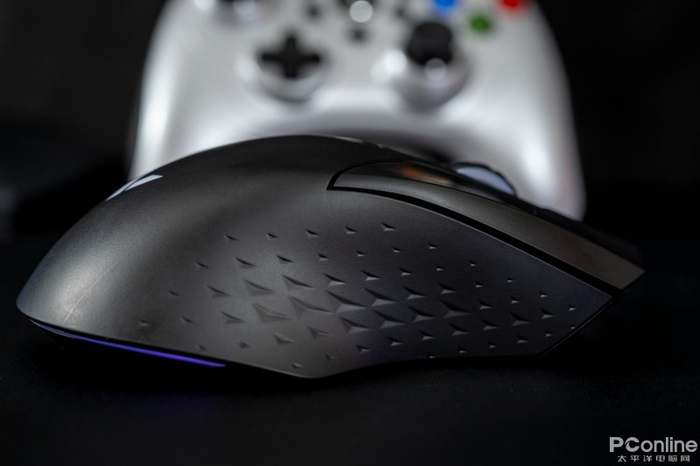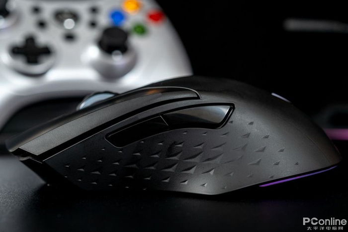 鼠标左右两侧拥有防滑V型纹理,左边配有前进后退键,相比橡胶材质,得到相近防滑性能同时兼顾了透气排汗效果,对我这种多手汗玩家非常友好。