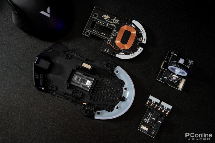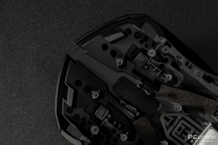 拆解后来到感受最明显的左右键部分。可以明显发现内部做工细节较为规整,模具公差较小,有多处打孔,相信是为了减重设计的。