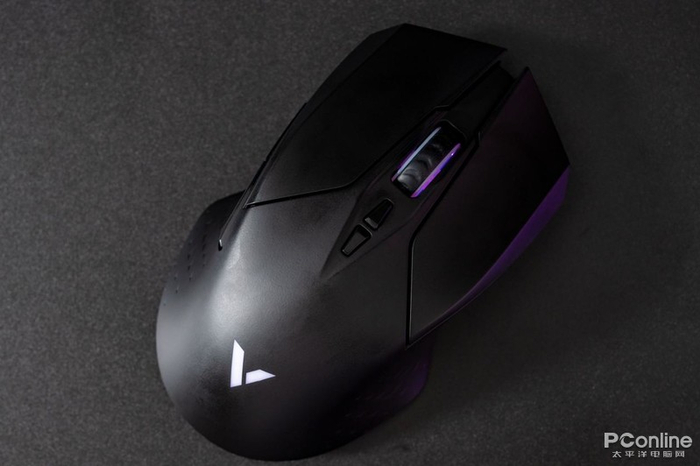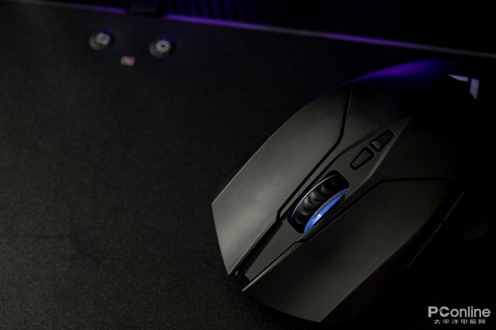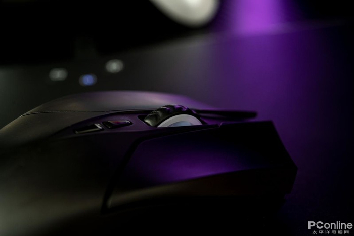 鼠标表面采用哑光黑配色,材质为类肤质,握持感受一个字:润!左右键导槽延伸至顶部,采用分离式设计,保持两边手感一致性。内置两颗欧姆龙2000万次微动,实际体验手感舒适偏软;中间是电竞型50万次刻度手感滚轮,实际使用刻度感明显,不易误触,有RGB加持。