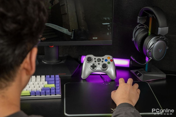 尾部是雷柏透光logo,从侧面看,雷柏V20W顶点居中靠后,尾部侧裙的大收腰设计,有效填充大小拇指附近的空隙,我们请来中手型的同事测试了常用三种握姿,无论哪种体验都比较舒适,长时间使用不易产生疲劳感。