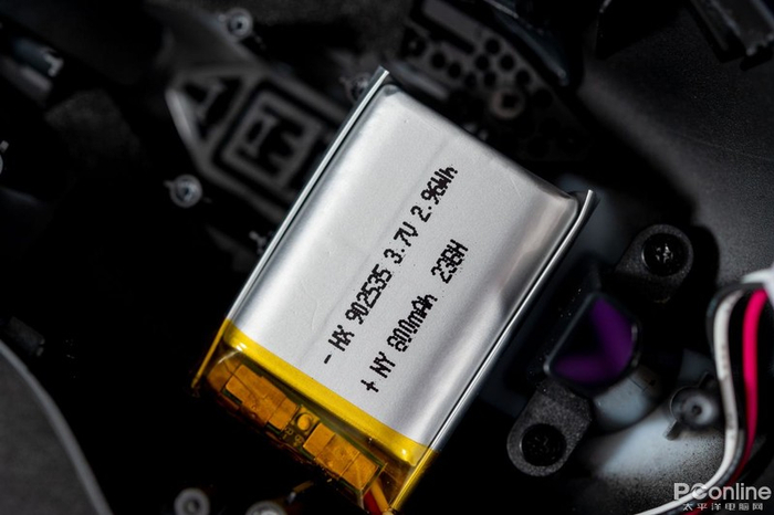 鼠标背部电池有缓震海绵填充,消减跌落带来的冲击。电池容量为800mAh,这在无线游戏鼠标中算是非常大的了。在日常使用过程中足以实现一周以上的续航。