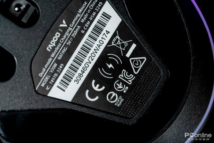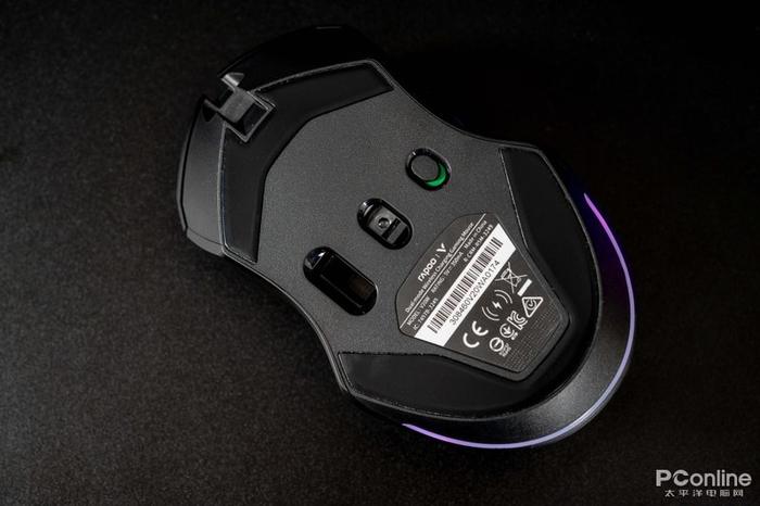 来到底部,上方是USB-C接口,由于位置较窄,只支持雷柏标配数据线,也算是配件物尽其用;中间是磁吸式接收器收纳位以及电源开关;下方则是鼠标铭牌以及环绕式RGB,上面的闪电标识表明了该鼠标一大卖点:无线充电,据官方称支持QI协议的无线充。RGB照应前面滚轮及Logo处灯光,电竞氛围感拉满。